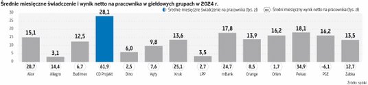 Z ankiety „Parkietu” przeprowadzonej wśród spółek, których akcje zaliczane są do indeksu WIG20 (odpowiedziało na nią 14 firm), wynika, że największe świadczenia pracownicze per capita miały miejsce w ubiegłym roku w grupie CD Projekt. Na koniec grudnia przypadało ich po 28,1 tys. zł miesięcznie. W tym miejscu należy jednak zastrzec, że polski wydawca i producent gier komputerowych pod pojęciem pracowników rozumie tych objętych umową o pracę. Ponadto pytany o wydatki osobowe podaje, że jedyną publiczną informacją dotyczącą wynagrodzeń jest pozycja pt. wynagrodzenia, ubezpieczenia społeczne i inne świadczenia.