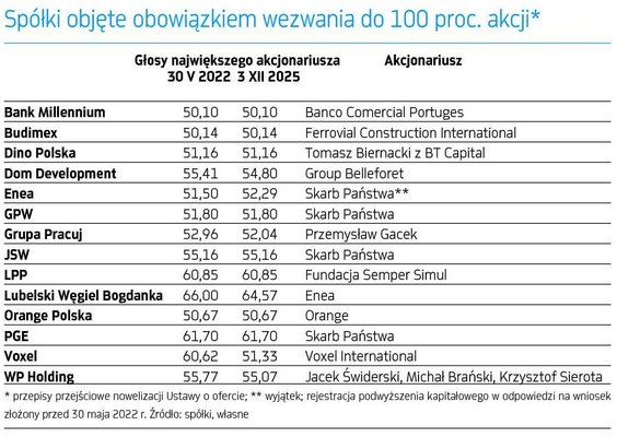 Przypomnijmy, że zgodnie z tymi zmianami, przekroczenie progu 50 proc. głosów na walnym zgromadzeniu (a nie – jak wcześniej – dopiero 66 proc.) rodzi obowiązek ogłoszenia wezwania na wszystkie pozostałe walory. Co więcej, firmy, których główni akcjonariusze w momencie wejścia w życie zmian w przepisach już mieli ponad 50 proc. głosów na walnych zgromadzeniach, ale nie więcej niż 66 proc., także zostały objęte takim obowiązkiem. Tzw. przepisy przejściowe mówią, że akcjonariusz może zwiększyć zaangażowanie, ale jeśli wykona taki ruch, musi ogłosić wezwanie na wszystkie pozostałe akcje.
