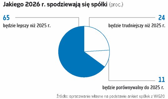 W 2026 r. polska gospodarka urośnie o ponad 3 proc., konsumpcja utrzyma się na solidnym poziomie, a inwestycje przyspieszą. Prognozowane jest również dalsze hamowanie dynamiki wynagrodzeń. Takie otoczenie makroekonomiczne powinno sprzyjać przedsiębiorcom. Nic dziwnego, że w naszej corocznej ankiecie, rozsyłanej do spółek z WIG20, dominuje optymizm.