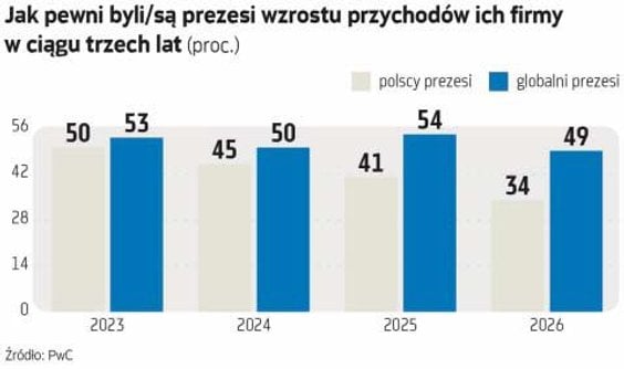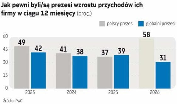 Aż 58 proc. polskich prezesów oczekuje wyższych przychodów swoich firm w perspektywie roku, wobec tylko 31 proc. globalnie - wynika z tegorocznego raportu PwC. Duży optymizm nie oznacza jednak braku obaw. Względem ubiegłorocznej edycji badania znacznie wzrósł odsetek polskich prezesów obawiających się o niepewność makroekonomiczną (z 37 proc. do 55 proc.) i konflikty geopolityczne (z 27 proc. do 37 proc.). Obawy okazały się uzasadnione - raport opublikowano w lutym, tymczasem już w marcu po zaognieniu się konfliktu na Bliskim Wschodzie sytuacja makro i geopolityczna się pogorszyła. Wojna USA i Izraela z Iranem przełożyła się na drastyczny wzrost cen paliw, co rodzi obawę o długofalowy impuls inflacyjny.