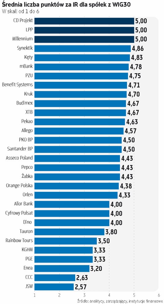 Średnia ocena dla wszystkich spółek z WIG30 sięgnęła 4,3 pkt w sześciostopniowej skali. To nieco wyższy wynik niż rok temu (4,1 pkt), mieszczący się w przedziale obserwowanym od początku trwania badania (od 4 do 4,3 pkt).