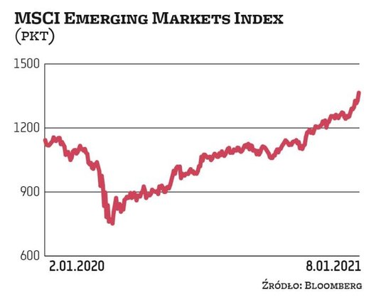 – MSCI EM, podobnie jak większość globalnych rynków akcji, znajduje się od marca 2020 r. w trendzie wzrostowym. W ostatnich miesiącach widzimy jednak coraz większą, relatywną siłę tego indeksu względem rynków rozwiniętych – zauważa Michał Krajczewski, kierownik zespołu doradztwa inwestycyjnego, BM BNP Paribas. Jak dodaje, MSCI EM wybił się pod koniec roku ponad szczyty z początku 2018 r., co jest silnym sygnałem do kontynuacji trendu w kierunku historycznych maksimów z 2007 r. Z czego wynika siła rynków wschodzących? – Po pierwsze sprzyjającym dla aktywów emerging markets jest osłabienie się amerykańskiego dolara, wspierane przez akomodacyjną politykę Fedu. Po drugie obserwowany od listopada zwrot w kierunku cyklicznych aktywów i rosnące ceny surowców, szczególnie przemysłowych, również premiują spółki z tego obszaru – analizuje Krajczewski. Do tego znacząca część państw zaliczanych do grona rozwijających się, a szczególnie te z Azji Południowo-Wschodniej (z Chinami na czele), bardzo dobrze poradziła sobie z pandemią Covid-19, co przekłada się na znacząco lepszą względem większości państw rozwiniętych koniunkturę.