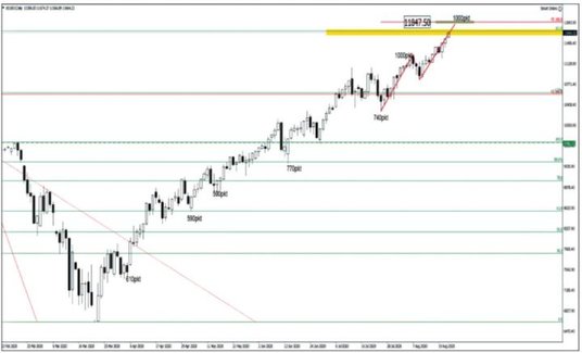 10 580 pkt – zwraca uwagę Paweł Śliwa, analityk BM mBanku. Jak dodaje, wyznaczanie nowych punktów zwrotnych i szczytów jest w obecnych warunkach utrudnione. – Spróbujmy wykorzystać ostatnią korektę jako bazę do wyliczeń. W poprzednim przypadku (korekta październik–grudzień 2018) stanowiła połowę impulsu z 2019 r. Jeżeli scenariusz miałby się powtórzyć teraz, to kolejnym oporem byłaby strefa znajdująca się blisko 13 000 pkt. Zanim to jednak może się zdarzyć, warto przyjrzeć się zniesieniu 161,8 proc., które wypada przy 11 700 pkt. Podobna analiza na interwale dziennym, zakładająca równość impulsów, wskazuje potencjalny opór przy poziomie 11 850 pkt. Można z tego stworzyć scenariusz zakładający utworzenie kolejnej korekty dziennej w przedziale 11 700–11 850 pkt – wskazuje Śliwa. PRT