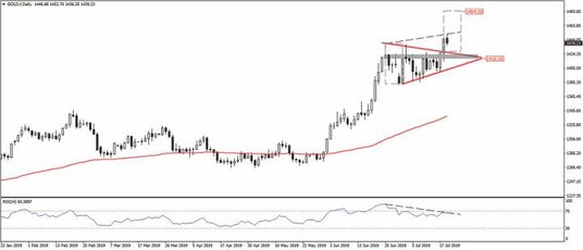– W przypadku realizacji zasięgu formacji cena doszłaby w okolicę 1484 dolarów. Niepokojącym sygnałem jest dywergencja między wykresem a wskaźnikiem RSI. W przypadku umocnienia się dolara amerykańskiego pierwsze wsparcie znajduje się na poziomie 1418 dolarów, które jednocześnie jest wierzchołkiem formacji trójkąta. Dojście do tej wartości mogłoby się okazać testem poziomu wsparcia i zakończenia korekty – wskazują eksperci z zespołu mForex.