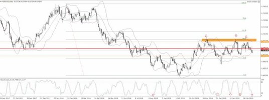 Górne ograniczenie to oczywiście opór, który dodatkowo został wskazany przez 50-proc. zniesienie ostatniej dużej fali deprecjonującej walutę Nowej Zelandii. Dodatkowo trzykrotne nieudane próby pokonania tej strefy zapewne cieszą zwolenników spadków. Ich radość ograniczona jest do 200 pipsów, gdyż tyle dzieli opór od wsparcia 0,6700. Wzrosty od tego miejsca często poprzedzane są niską wartością oscylatora stochastycznego. Aktualnie sytuacja może się powtórzyć, gdyż szybki oscylator stochastyczny przyjmuje wartość 15 punktów, co statystycznie sugeruje aprecjacje NZD. – Analizując ten instrument, nie można zapomnieć o kursie 0,6800, który w większej skali często rozdzielał silne wzrosty od spadków – wyjaśnia Paweł Śliwa, analityk DM mBanku. To jednak ewentualne wyjście z obecnego trendu bocznego ograniczonego wspomnianymi wcześniej poziomami będzie pierwszym poważniejszym sygnałem. – Przełamanie górnej strefy to jednocześnie przecięcie górnej bandy Bollingera i sygnał do powrotu powyżej 0,7000 z maksimum z ostatnich lat wypadającym na poziomie 0,7500. Przełamanie wsparcia to próba dotarcia do październikowego dołka 0,6400 – podkreśla Śliwa.