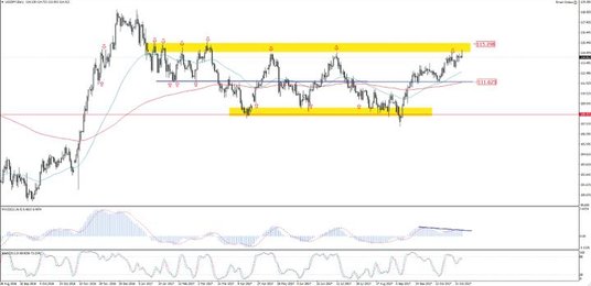– Dolar amerykański, tworząc nowy szczyt, sugeruje dalszy wzrost notowań tej waluty. Problem w tym, że para USD/JPY znalazła się blisko miejsca, które dotychczas było zdominowane przez podaż. Tym samym tak długo jak wartość tego instrumentu nie przełamie się na trwale powyżej 115,30, to każda próba skazana jest na porażkę. MACD nie potwierdza ostatnich zwyżek, tworząc tym samym negatywną dywergencję. Może to być zapowiedź malejącej siły popytu, który na „siłę" i dzięki odczytom makroekonomicznym próbuje wedrzeć się w strefę podaży – uważa Paweł Śliwa, analityk DM mBanku. Co to dokładnie oznaczałoby dla notowań pary USD/JPY? – Historia uczy, że skoro oporu nie da się przełamać, to tak jak w maju czy lipcu tego roku należy liczyć się z wyprzedażą dolara. Najbliższe wsparcie to 111,60 a potem dopiero 108,50. W przypadku jednak przełamania najbliższego oporu otworzy się droga do wzrostu w stronę 118 – uważa analityk.