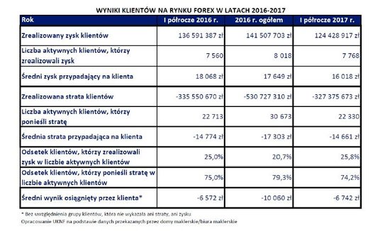 Komisja Nadzoru Finansowego opublikowała wyniki klientów osiągnięte na rynku forex w latach 2016-2017. Bazują one na metodologii opartej o wynik per saldo klienta na koniec danego okresu, będący efektem transakcji zrealizowanych na wszystkich klasach instrumentów pochodnych.
