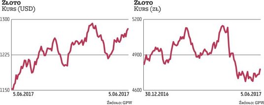 W efekcie w ciągu miesiąca, grając na zwyżki cen złota, można było zarobić blisko 5 proc. Cena tego kruszcu w poniedziałek oscylowała przy poziomie 1280 dolarów za uncję. – Notowania kruszcu znajdują się już coraz bliżej poziomu tegorocznych maksimów. W połowie kwietnia cena złota zbliżyła się do psychologicznej bariery 1300 dolarów za uncję. Piątkowy ruch na złocie był o tyle istotny z punktu widzenia analizy technicznej, że notowania złota naruszyły ważny opór w okolicach 1276 USD za uncję – zwraca uwagę Dorota Sierakowska, analityk DM BOŚ.