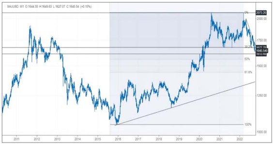 W ostatnich dniach cena królewskiego kruszcu przebiła dołki osiągnięte w kwietniu i sierpniu poprzedniego roku, czyli okolice 1677 dol. za uncję i cofnęła się już do poziomów z kwietnia 2020 r. W poniedziałek po południu jedna uncja wyceniana była na 1644,8 dol., jednak dzienne minimum wypadło na 1627 dol. Oznacza to, że od historycznego szczytu osiągniętego jesienią 2020 r., a następnie wyrównanego w marcu tego roku, cena uncji złota spadła o około 430 dol.
