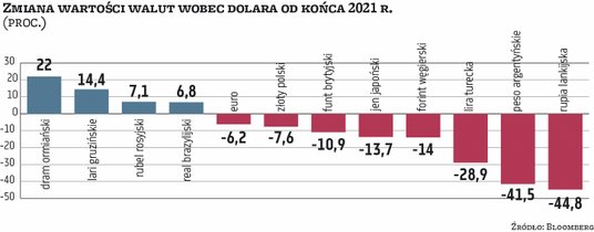 Walutą, którą od końca 2021 r. najbardziej zyskała wobec dolara, jest ormiański dram, który umocnił się aż o 22 proc. Wzrost popytu na drama jest w dużym stopniu skutkiem fali imigracji z Rosji, związanej z wojną w Ukrainie. Imigracja ta przyczyniła się również do umocnienia gruzińskiego lari (+14,4 proc.) czy nawet tadżyckiego somoni (+10,1 proc.). Rubel rosyjski zyskał w tym czasie o 7,1 proc. i znalazł się w pierwszej dziesiątce walut, które najbardziej zyskały wobec dolara. Jego aprecjacja była jednak mocno związana z administracyjnymi ograniczeniami w wymianie rubli oraz z załamaniem importu z Zachodu do Rosji, któremu towarzyszył skok cen surowców energetycznych.