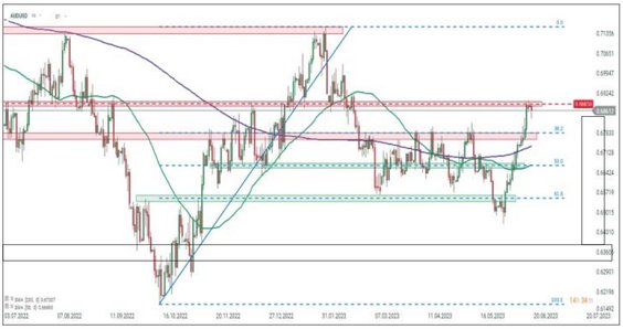 Australijski bank centralny ostatnio zaskoczył podwyżką stóp, a protokół z posiedzenia ma być wskazówką czy trzeba się szykować na więcej tego typu niespodzianek. – Inwestorzy będą szukać wskazówek, czy planowane są kolejne podwyżki stóp. Istnieje przekonanie, że ostatnie pozytywne dane gospodarcze oraz bardziej zdecydowane podejście innych banków centralnych skłonią RBA do kolejnej podwyżki stóp na lipcowym posiedzeniu – podkreślają eksperci XTB. Notowania pary AUD/USD też znalazły się w ciekawym miejscu. – Para zatrzymała wzrost po osiągnięciu strefy oporu w okolicach 0,6885. Zanotowała ogromną zwyżkę (prawie 7 proc.) w pierwszej połowie czerwca i biorąc pod uwagę, jak gwałtowny był to ruch, nie można wykluczyć korekty lub okresu realizacji zysków. Jednak jeśli obecna korekta się pogłębi, pierwszym poziomem wsparcia do obserwacji będzie strefa zniesienia 38,2 proc. impulsu wzrostowego rozpoczętego w październiku 2022 roku – wskazują przedstawiciele XTB.