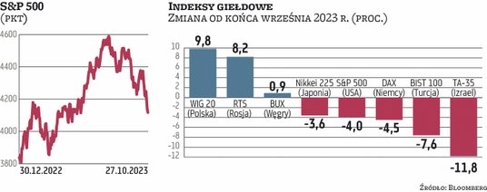 Nowojorski indeks S&P 500 stracił od szczytu z lipca już ponad 10 proc. Wszedł więc w korektę. W fazie korekty jest też Nasdaq Composite, który od letniego szczytu zniżkował o 12 proc. Październik nie był dobrym okresem dla obu indeksów. S&P stracił od końca września 4 proc., a Nasdaq Composite ponad 4,5 proc. Urósł za to VIX, czyli tzw. indeks strachu (odwzorowujący oczekiwaną zmienność na rynku opcji na indeks S&P 500). W dołku z połowy września wynosił on 12,8, a w poniedziałek sięgał 20,7 pkt. 20 października doszedł do 21,7 pkt, czyli do najwyższego poziomu od marcowego kryzysu bankowego. Inwestorów na rynku akcji niepokoił m.in. wzrost rentowności obligacji, w tym to, że dochodowość amerykańskich papierów dziesięcioletnich chwilowo przebiła poziom 5 proc. Dodatkowym powodem do obaw rynkowych była wojna pomiędzy Izraelem a Hamasem.