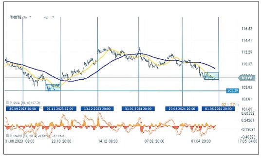 – Cena kontraktu na indeks cen obligacji dziesięcioletnich (TNOTE) znajduje się mniej niż 2 proc. od dołków, które były widoczne pod koniec 2023 r. Co więcej, w obecnym scenariuszu rynki są już nastawione jastrzębio. Stąd jakakolwiek łagodniejsza postawa Fedu może być sygnałem do odbicia w górę. Z drugiej strony istnieje także ryzyko bardziej jastrzębiej postawy Fedu, co mogłoby zbić kurs TNOTE w kierunku przetestowania lokalnych minimów i przesunąć potencjalne odbicie na następne miesiące. Jednak w obydwu przypadkach, zakładając brak powrotu do podwyżek stóp procentowych, potencjalny zasięg dalszych spadków TNOTE jest ograniczony – mówią specjaliści.