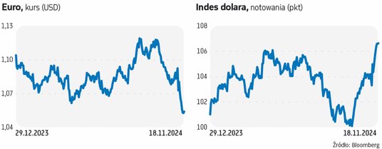 Dolar okazał się wielkim wygranym „Trump trade”. Proinflacyjne zapowiedzi prezydenta-elekta Stanów Zjednoczonych stawiają bowiem pod znakiem zapytania dalszą ścieżkę obniżek stóp procentowych w USA. Jak jednak podkreśla Przemysław Kwiecień, główny ekonomista XTB, i bez tego aspektu sytuacja, z punktu widzenia Fedu, zaczyna się komplikować. – Kolejny raport potwierdził spowolnienie dojścia inflacji do celu, a dane z realnej gospodarki nie wskazują na dalsze spowolnienie. Zatem narracja z wrześniowego posiedzenia o potrzebie szybkiego dojścia ze stopami do okolic 3 proc. (lub nawet nieco niżej) i tak stanęłaby pod znakiem zapytania. Jeśli jednak dołożymy do tego proinflacyjny charakter polityki celnej i niekoniecznie świetne relacje Trumpa z Powellem (co technicznie nie powinno mieć znaczenia, ale…), nagle może się okazać, że cykl obniżek będzie znacznie mniejszy lub wręcz się zatrzyma. To miałoby dwojakie konsekwencje: pozwoliłoby na wybicie dołem parze EUR/USD z trwającej już niemal dwa lata konsolidacji z konsekwencjami dla wielu innych rynków (w tym złotego) oraz stworzyłoby zagrożenie wciągnięciem gospodarki w recesję w późniejszym okresie (tu z konsekwencjami dla giełd). Dlatego wydaje się, że decyzje w zakresie polityki handlowej mogą być absolutnie kluczowym sygnałem – uważa Kwiecień.