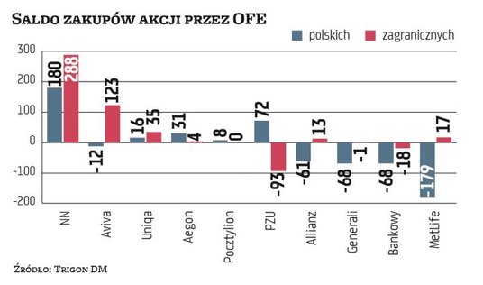 Fundusze emerytalne w listopadzie pozbywały się polskich akcji, wartych około 80 mln zł – podaje Trigon DM. Z drugiej strony OFE chętnie kupowały akcje za granicą, łącznie za około 300 mln zł. Jak podają analitycy, nastawienie OFE było jednak podzielone, zarówno w odniesieniu do akcji polskich, jak i zagranicznych. Najwięcej na akcje wydał NN OFE – 180 mln zł na polskie oraz 288 mln zł na zagraniczne. Po stronie sprzedających w listopadzie wyróżniał się MetLife OFE, który głównie pozbywał się walorów polskich spółek za około 179 mln zł.