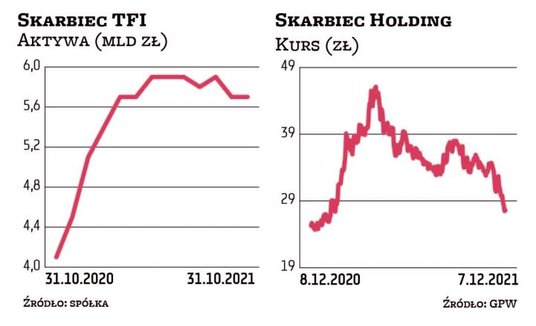 Słabo zaczął się także grudzień – od początku miesiąca zniżka sięga około 7 proc. Z tego ponad 3-proc. spadek nastąpił po publikacji projektów uchwał na walne zgromadzenie akcjonariuszy, które odbędzie się pod koniec roku. Wygląda na to, że spółka po raz drugi sprawi zawód inwestorom i nie podzieli się, podobnie jak w poprzednim roku, wypracowanym w roku obrotowym zyskiem. To zdaniem analityków jest główną przyczyną przeceny walorów Skarbca. Przypomnijmy, że brak dywidendy przed rokiem tłumaczono niepewną sytuacją w otoczeniu pandemii. Następnie prezes Skarbca Holdingu, Anna Milewska, kilka razy podkreślała, że decyzja o dywidendzie jest w gestii akcjonariuszy, a przypomnijmy, że głównym udziałowcem spółki jest nieznany szerzej Aoram.