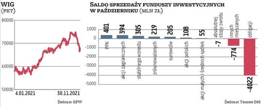 Czy ofertami publicznymi można przynajmniej częściowo tłumaczyć listopadową przecenę na GPW? – Ostatnio na krajowy rynek nałożyło się sporo negatywnych czynników, częściowo spadki mogą być jednak spowodowane szykowaniem gotówki pod IPO, których łączną wartość można szacować na około 3 mld zł. Nie widać znaczących napływów do funduszy, nie ma masy nowych środków, które można by przeznaczyć na zakup tychże spółek – zauważa Michał Stalmach, zarządzający Skarbca TFI. – Główną przyczyną pogorszenia nastrojów były jednak wydarzenia na wschodniej granicy, lockdowny (np. w Austrii) czy istotnie wyższy wzrost cen producentów nad cenami sprzedaży – zaznacza zarządzający. Podobne zdanie ma Ryszard Miodoński, dyrektor ds. strategii akcyjnych, Noble Funds TFI. – Ewentualne przygotowywanie się funduszy pod trwające oferty IPO to tylko niewielki element w całej układance, która w ostatnim czasie doprowadziła do silnych przecen na krajowym rynku. Ważniejszym są narastające presje inflacyjne i ryzyka dla tempa wzrostu gospodarczego w Polsce, konflikt z EU, lockdowny w niektórych państwach czy wydarzenia na naszej wschodniej granicy – komentuje.