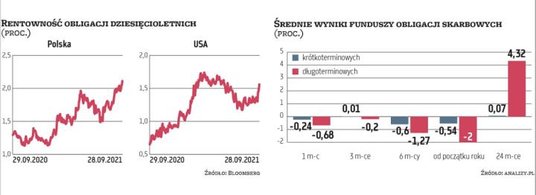 Do niedawna polskie obligacje przeceniały się przy trendzie bocznym w USA. Ostatnio jednak obserwujemy skok rentowności za oceanem, na co reaguje polski rynek. – Rentowności w Polsce nie uciekną od tego, co się dzieje na głównych rynkach na świecie. Nie tylko w USA, gdzie rentowności od początku miesiąca wzrosły o blisko 25 pb, ale także w strefie euro. Na przykład w Niemczech było to 30 bps w ciągu pięciu tygodni – zauważa Jarosław Leśniczak, zarządzający TFI PZU. Jak dodaje, wzrosty rentowności u nas wpisują się w globalną tendencję. – Przyczyną oczywiście są narastające problemy inflacyjne na świecie, w tym w Polsce. Do braków niektórych podzespołów produkowanych w Azji (m.in. procesory, wyświetlacze, osprzęt rowerowy) dołącza eksplozja cen surowców energetycznych (ropa, gaz, węgiel). Postępuje wzrost gospodarczy, więc popyt na towary i usługi też jest duży – tłumaczy ekspert TFI PZU.