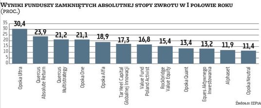Z zamkniętych funduszy, realizujących strategię absolutnej stopy zwrotu, najwyższy wynik w I półroczu wypracował Opoka Ultra i było to nieco ponad 30 proc. Inne fundusze Opoki TFI również są wysoko i notują dwucyfrowe stopy zwrotu. W ścisłej czołówce jest także Quercus Absolute Return FIZ (23,9 proc.) oraz Quercus Multistrategy FIZ (21,2 proc.).