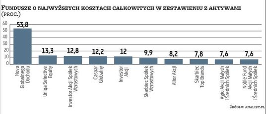 Jak podaje serwis analizy.pl, najwyższy wskaźnik TER wśród funduszy otwartych miał za 2020 r. Novo Globalnego Dochodu i było to 53,8 proc., przy czym same opłaty bieżące sięgnęły 27,6 proc. Za nim plasował się Uniqa Selective Equity z TER na poziomie 13,3 proc., a dalej Investor Akcji Spółek Wzrostowych, w którym koszty całkowite dla inwestora wyniosły 12,8 proc. Również dwucyfrowe koszty ponieśli uczestnicy Caspara Globalnego oraz Investor Akcji. Jak widać, tak wysoki TER najczęściej wiąże się z opłatami za wyniki funduszy. Wyjątkiem na powyższej liście jest Novo Globalnego Dochodu. Jak tłumaczy serwis analizy.pl, powodem tak wysokiego TER (oraz opłat bieżących) są bardzo niskie aktywa, które sięgają 63 tys. zł. Ze sprawozdania finansowego na koniec 2020 r. wynika tymczasem, że sam koszt wynagrodzenia dla depozytariusza w poprzednich dwóch latach wyniósł ponad 60 tys. zł.