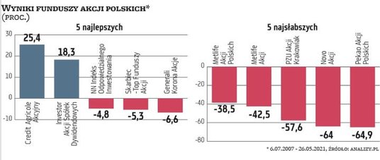 Jak wynika z danych udostępnionych nam przez serwis analizy.pl, w okresie między 6 lipca 2007 r. (szczyty poprzedniej hossy) a 26 maja tego roku średnia stopa zwrotu funduszy akcji polskich uniwersalnych to blisko 24 proc. straty. Tylko dwa fundusze z tej grupy w tym okresie okazały się lepsze od indeksu i są to Credit Agricole Akcyjny (z oferty Santander TFI) oraz Investor Akcji Spółek Dywidendowych.