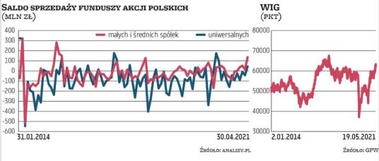 Według Stalmacha rosnąca popularność akcji nie jest jeszcze sygnałem przegrzania rynku. – Nie widzimy w mediach nagłówków kierowanych do szerokiego grona odbiorców, niejako wskazujących na konieczność inwestycji w akcje, czy wysokich odczytów nastrojów inwestorów już obecnych na rynku – zauważa zarządzający Skarbca TFI. Jak dodaje, biorąc pod uwagę historyczną korelację napływów do funduszy inwestujących w polskie akcje oraz zachowania indeksów, oczywistym beneficjentem napływów będzie sWIG80, który już teraz, patrząc na 2020 r. czy też na stopę zwrotu od początku roku, zachowuje się zdecydowanie lepiej niż indeksy giełd krajów rozwiniętych czy MSCI EM.