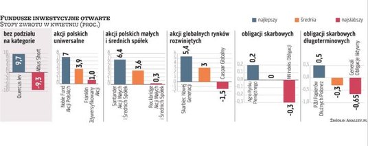 W kwietniu bardzo dobrze wypadły fundusze akcji polskich i to zarówno szerokiego rynku (przeciętnie 3,9 proc.), jak i małych i średnich spółek. Grupę funduszy uniwersalnych otwiera Noble Fund Akcji Polskich z wynikiem aż 7 proc. Bezpośrednio za nim uplasowały się Quercus Agresywny oraz Novo Akcji.