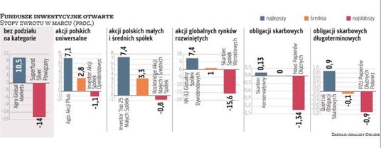 Sytuacja na rynkach akcji w ostatnich tygodniach jest stabilna i pozwala zarobić inwestorom. Jedną z ciekawostek jest przebicie przez amerykański S&P 500 na początku kwietnia poziomu 4 tys. pkt i oczywiście ustanowienie nowych rekordów. Najwyższy w historii pułap udało się osiągnąć także niemieckiemu DAX. Główne krajowe indeksy ostatnie tygodnie spędzają w trendzie bocznym, wyjątkiem jest sWIG80, który skutecznie napędza wyniki funduszy akcji małych i średnich spółek. Pod względem średniej stopy zwrotu grupa ta plasowała się na drugim miejscu w marcowym zestawieniu, z 3,3-proc. stopą zwrotu. Najlepszy w grupie – Investor Top 25 Małych Spółek – zarobił 7,4 proc., a tylko jeden portfel kończył miesiąc pod kreską. Podobnie ponad 7-proc. stopy zwrotu pojawiły się wśród funduszy akcji polskich uniwersalnych. Udało się to zarządzającym Agio Akcji Plus oraz Quercusa Agresywnego. W tej kategorii jednak przeciętny wynik to 2,8 proc., dający miejsce tuż za podium.