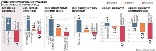 Nie tylko rynek obligacji zachował się w lutym słabo. Dużym przecenom poddały się także fundusze metali szlachetnych, głównie nastawionych na rynek złota. Średni wynik to nieco ponad 6 proc. pod kreską, choć należący do tej grupy Superfund Goldfuture zdołał przynieść 4,6 proc. zysku. Dwa inne fundusze Superfund TFI, inwestujące na rynku srebra, przyniosły po blisko 15 proc. zysku. – Spodziewamy się, że w dalszym ciągu srebro będzie lepiej radziło sobie od złota, a przemawiają za tym przede wszystkim rosnący popyt na srebro z przemysłu oraz wzrost zainteresowania srebrem wśród inwestorów – komentuje Konrad Ogrodowicz, zarządzający Superfund TFI.