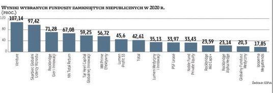 Jak wynika z zestawienia IZFiA, w przypadku aż 71 funduszy niepublicznych właściciele certyfikatów mogli liczyć na zyski w 2020 r. Co więcej, aż 31 z nich wypracowało dwucyfrową stopę zwrotu.