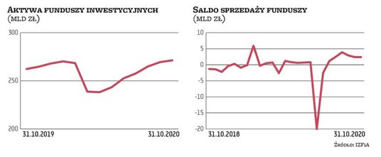 Jak wynika z danych Izby Zarządzających Funduszami i Aktywami, z końcem października w funduszach inwestycyjnych Polacy utrzymywali 271,3 mld zł. Miesiąc wcześniej było to 269,5 mld zł. Aktywa pod zarządzaniem TFI rosną w ostatnim czasie z miesiąca na miesiąc. Łącznie od maja przybyło już ponad 33 mld zł. W ponad połowie był to efekt odbicia na rynkach, natomiast w ciągu sześciu minionych miesięcy klienci wpłacili do funduszy około 15 mld zł. Tym samym rynek powraca do poziomów notowanych pod koniec stycznia. Przy analizie trzeba jednak pamiętać, że skład TFI raportujących do IZFiA niekiedy się zmienia.