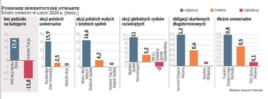 Co ciekawe, nie pierwszy raz w tym roku najlepsze były znów fundusze uznawane raczej za defensywną klasę aktywów, czyli metali szlachetnych. Średnia w tej wciąż dość wąskiej grupie funduszy krajowego rynku przekroczyła w lipcu 11 proc. Warto pamiętać, że fundusze te mają często ekspozycję na akcje spółek związanych z rynkiem surowców, które podczas zwyżek metali zyskują znacznie mocniej. Również w okresie ostatnich trzech, a także dwunastu miesięcy fundusze metali szlachetnych przyniosły średnio najwyższe wyniki, odpowiednio 16 oraz blisko 40 proc. zysku. Oczywiście nie mają sobie równych w okresie od początku roku, przynosząc blisko 30 proc. zysku. Żadna inna grupa funduszy nie przyniosła przeciętnie choćby dwucyfrowych zysków. Fundusze mocno zależne od rynku surowców znajdziemy także w innych grupach, m.in. wśród strategii absolutnej stopy zwrotu.