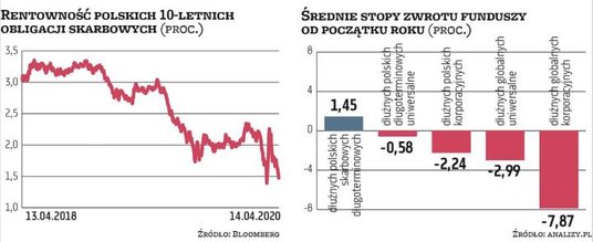 Wyniki funduszy obligacji skarbowych w tym roku mocno się wahają. Obawy o wzrost inflacji na przełomie roku powodowały, że rentowności dziesięcioletnich papierów skarbowych wzrosły nawet powyżej 2,25 proc., co przekładało się na większość funduszy negatywnie. Potem jednak głównym tematem stał się koronawirus. Przestraszeni inwestorzy znów skierowali kapitał do funduszy dłużnych, przez co oprocentowanie obligacji dziesięcioletnich gwałtownie spadło, ustanawiając nowe rekordy przy 1,44 proc. Zaraz po tych spadkach nastąpiły jednak mocne wzrosty, w okolice wspomnianych 2,25 proc. Był to efekt wycofywania kapitału przez inwestorów (głównie przedsiębiorstwa) z funduszy dłużnych. Jak już dziś wiadomo, z funduszy dłużnych odpłynęło w marcu blisko 18 mld zł netto. Dopiero zapowiedź interwencji oraz skup obligacji skarbowych przez NBP uspokoiły sytuację, a wskaźnik rentowności skierował się w kierunku marcowych rekordów.