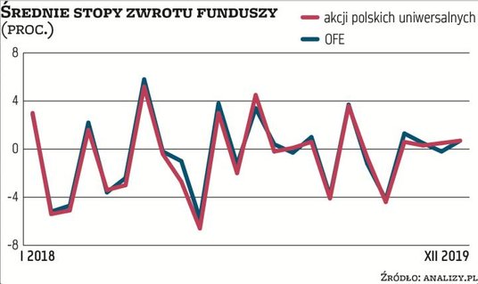 Zmianę nastawienia do polskich akcji, która nastąpiła w grudniu wśród TFI, widać było już od kilku miesięcy w przypadku OFE. We wrześniu popyt OFE przeważył o 28 mln zł, w październiku o 356 mln zł, a w listopadzie o 244 mln zł. Jak wynika z raportu Trigon DM, także w grudniu OFE głównie kupowały akcje. Korygując o wezwanie na Asseco Poland, z którego OFE mogły otrzymać około 600 mln zł, popyt funduszy emerytalnych na polskie akcje sięgnął w ostatnim miesiącu 2019 r. niemal 500 mln zł – szacuje Marcinowski.
