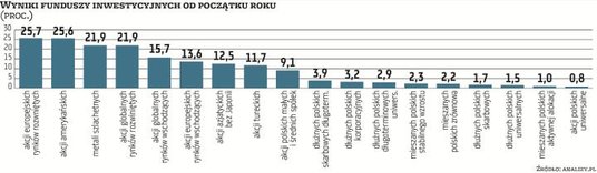 Fundusz ten pod względem wyników od początku roku był przez kilka miesięcy liderem pośród krajowej oferty. Jednak od początku maja bardzo gwałtownie zaczął zyskiwać PKO Akcji Rynku Złota. Fundusz ten ma w portfelu akcje spółek powiązanych z rynkiem złota, w tym przedsiębiorstw wydobywczych. Oczywiście ich wyceny mocno reagują na ruchy ceny samego złota. Uncja tego metalu pod koniec maja kosztowała około 1280 dolarów, a w trzy miesiące wzrosła do ponad 1540 dolarów. W kolejnych kilku miesiącach Skarbiec Spółek Wzrostowych oraz PKO Akcji Rynku Złota zamieniały się miejscami na czele wyników funduszy od początku roku. Ten pierwszy dużą część zysków z pierwszych miesięcy stracił jednak we wrześniu, kiedy doszło do silnej przeceny spółek technologicznych. Wycena jednostki runęła z ponad 140 zł do około 120 w dwa miesiące. Listopad przyniósł zdecydowaną poprawę, natomiast według ostatniej wyceny, na 24 grudnia, Skarbiec Spółek Wzrostowych zarobił od początku stycznia blisko 36 proc. przy średniej dla swojej grupy wynoszącej niecałe 22 proc. Ostatnie dni są z kolei znów udane dla złota – cena uncji powróciła nad poziom 1500 dolarów, co umacnia PKO Akcji Rynku Złota na pierwszym miejscu z wynikiem 46 proc. w niecałe 12 miesięcy.