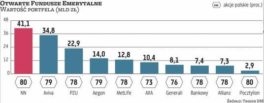 Tym jedynym OFE z udziałem akcji polskich poniżej 75 proc. w portfelu było AXA. W dwóch przypadkach alokacja w polskie akcje sięgała na koniec lutego aż 80 proc. Były to fundusze emerytalne Pocztyliona OFE i NN OFE. Z tym że cały portfel Pocztyliona OFE wynosił 2,885 mld zł, natomiast portfel NN OFE wart był aż 41,1 mld zł, czyli najwięcej w grupie funduszy emerytalnych. W przypadku drugiej co do wielkości aktywów Avivy (34,76 mld zł), alokacja w polskie akcje wynosiła 79,3 proc. Od kilku miesięcy OFE wyprzedają polskie akcje. Według analityka Trigona DM w lutym fundusze emerytalne pozbyły się tego typu papierów o łącznej wartości około 600 mln zł i był to trzeci miesiąc z rzędu negatywnego nastawienia do polskich akcji.