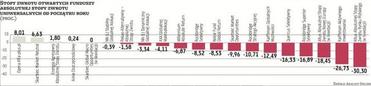Ten rok obnażył słabość części funduszy absolutnej stopy zwrotu, choć oczywiście w przypadku niektórych towarzystw (Altus czy Trigon) mocne zniżki są związane przede wszystkim z wycofywaniem pieniędzy przez klientów. Niemniej mamy również przykłady, gdzie nie ma takiego problemu, a jednak pojawiły się nawet dwucyfrowe straty. Z założenia fundusze absolutnej stopy zwrotu powinny przynosić zysk w każdych warunkach rynkowych, ale to tylko teoria. Jak wynika z danych serwisu Analizy Online, we wrześniu ponad 70 proc. rozwiązań tego typu poniosło straty.