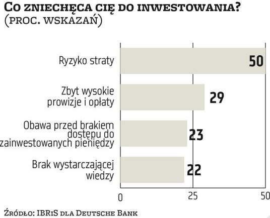 A co zniechęca zamożnych Polaków do inwestowania? Na pierwszym miejscu – 50 proc. wskazań – ryzyko poniesienia straty. Na drugim – 29 proc. wskazań – zbyt wysokie prowizje i opłaty.