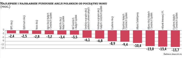 Pierwsze tygodnie nowego roku są trudne na rynkach akcji, w tym polskim. Indeks szerokiego rynku we wtorek po południu lekko zwyżkował, jednak spadek od początku roku sięga około 7,5 proc. W takich warunkach trudno oczekiwać, by fundusze akcji polskich (uniwersalne oraz małych i średnich spółek) zarabiały, jednak różnice w wynikach są spore. Obecnie najlepszy fundusz od najsłabszego dzieli około 11 pkt proc.