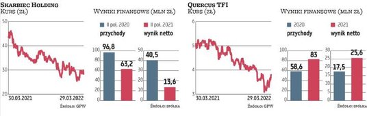 Reakcje inwestorów na wyniki dwóch TFI obecnych na głównym rynku były różne. Akcje Quercusa drożały we wtorek po południu o 4,6 proc., do 3,87 zł, z kolei walory Skarbca Holdingu traciły 5,4 proc., do 28,3 zł. W dłuższym okresie, czyli w horyzoncie 12 miesięcy, obie spółki pozostają w trendzie spadkowym. Papiery Quercusa zostały przecenione o 26 proc., a Skarbca o 33 proc. Pierwsza ze spółek wyceniana jest na 228 mln zł przy 4,21 mld zł aktywów pod zarządzaniem na koniec lutego. W funduszach Skarbca znajdowało się wówczas około 6 mld zł aktywów, a obecna kapitalizacja to 193 mln zł.