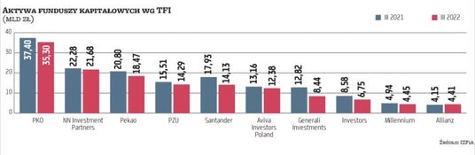 Dzięki funduszom dłużnym krajowe TFI, szczególnie bankowe, latami rosły jak na drożdżach, ale ostatnie 12 miesięcy dla większości z nich jest co najmniej kiepskie. Ogółem w ciągu ubiegłych 12 miesięcy spośród 25 TFI, które w funduszach rynku kapitałowego mają przynajmniej 0,5 mld zł aktywów, tylko sześć zdołało pomnożyć aktywa pod zarządzaniem. Są to Allianz, Quercus, AgioFunds, Caspar, MetLife oraz Superfund. Najsłabiej w skali 12 miesięcy wypada Opera. Z kolei wśród największych towarzystw najmocniej spadły aktywa w funduszach Generali Investments. Zniżka rok do roku sięga w tym przypadku blisko 4,4 mld zł, czyli aż 34 proc. Podobnej dynamiki spadek aktywów funduszy rynku kapitałowego ma za sobą także Ipopema. Powodów do zadowolenia nie mają także mniejsze bankowe TFI, które wcześniej dynamicznie rosły, czyli BNP Paribas oraz Alior, gdzie zniżki w skali 12 miesięcy są bliskie 30 proc.