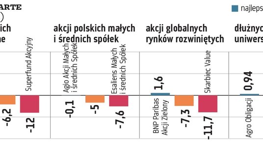 Mimo dynamicznej korekty i zwyżek notowań obligacji w ostatnich dwóch tygodniach, wszystkie grupy funduszy dłużnych zakończyły czerwiec na czerwono. Najsłabiej wypadły oczywiście wspomniane już fundusze papierów skarbowych długoterminowych, gdzie przeciętna strata w czerwcu to 1,5 proc., a po całym I półroczu 10,9 proc. W pozostałych głównych grupach funduszy dłużnych przeciętne straty w ostatnim miesiącu I połowy roku ograniczały się od 0,6 do 0,9 proc., a licząc od początku roku, spadki są już jednocyfrowe. Fundusze dłużne uniwersalne oraz papierów korporacyjnych w sześć miesięcy straciły średnio po 3,5 proc., a uniwersalne długoterminowe 8,6 proc. Najbardziej odporna na wzrosty rentowności okazała się grupa funduszy papierów skarbowych, gdzie spadki ograniczyły się przeciętnie do 2,4 proc.