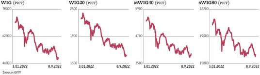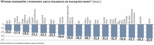 Do WIG20 przylgnęła już łatka najgorszego indeksu na świecie w tym roku. Jak na razie całkowicie zasłużenie, bo jego wynik po nieco ponad ośmiu miesiącach tego roku to 35-proc. strata, choć w drugiej połowie mijającego tygodnia popyt zaczynał łapać równowagę przy ogólnej poprawie nastrojów na globalnych rynkach. W czwartek WIG20 próbował wrócić w okolice 1500 pkt. Fundusze akcji polskich z reguły wyglądają w tym roku lepiej od indeksu blue chips. W grupie akcji polskich szerokiego rynku średnia strata według najnowszych wycen sięga 26,6 proc. i jest to w porównywalnym okresie o 9,3 pkt proc. wynik lepszy od WIG20 (oraz o 3,6 pkt proc. lepszy od WIG) – wynika z danych serwisu Analizy Online. Dla porównania w gronie funduszy małych i średnich spółek przeciętna stopa zwrotu to 23,2-proc. strata, przy czym sWIG80 w tym samym czasie był 17 proc. pod kreską, a mWIG40 27,4 proc. na minusie.