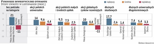Będąc przy obligacjach, warto odnotować kondycję portfeli metali szlachetnych, którym sprzyjała odwilż na globalnym rynku długu. Najlepszy w grupie inPZU Akcje Rynku Złota O zarobił ponad 17 proc., natomiast średnia sięgnęła 10,9 proc.