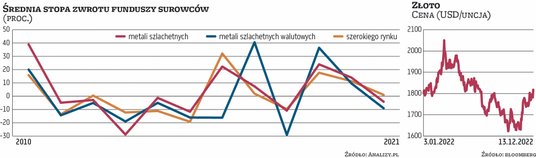 – Dotychczas złoto w tym roku notuje symboliczną stratę, ale zostało jeszcze ponad dwa tygodnie do końca roku, więc nie przesądzałbym, że kruszec zakończy ten rok na czerwono – zastrzega Filip Nowicki, zarządzający Superfund TFI. – Bez wątpienia kończący się rok był rokiem dolara, co w połączeniu z dynamicznie rosnącymi rentownościami obligacji było ciężarem dla złota. Wydaje się, że najgorsze z żółtym metalem już za nami, dynamika podwyżek stóp procentowych w USA będzie niższa w nadchodzących kwartałach i z każdym kwartałem będziemy bliżej rozpoczęcia cyklu obniżek stóp procentowych w USA, co powinno przekładać się również na poprawę nastawienia do rynku złota – przewiduje Nowicki. Zarządzający Superfund TFI zwraca uwagę, że złoto od około 18 miesięcy porusza się w trendzie bocznym po dynamicznych wzrostach z lat 2018–2020 i jego zdaniem scenariuszem bazowym w dalszym ciągu pozostaje kontynuacja trendu wzrostowego.