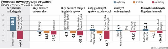 Słaby grudzień w wykonaniu obu tych grup sprawił, że zakończyły one 2022 r. z ponad 20-proc. spadkami. Jednocześnie były to najgorsze fundusze 2022 r. Zdecydował o tym właściwie ostatni miesiąc ubiegłego roku. Przypomnijmy, że przez dość długi okres to krajowy rynek raził słabością, a WIG20 przez pewien czas pozostawał najsłabszym indeksem na świecie. Ostatecznie fundusze akcji polskich zakończyły ubiegły rok, tracąc średnio 16,3 proc.