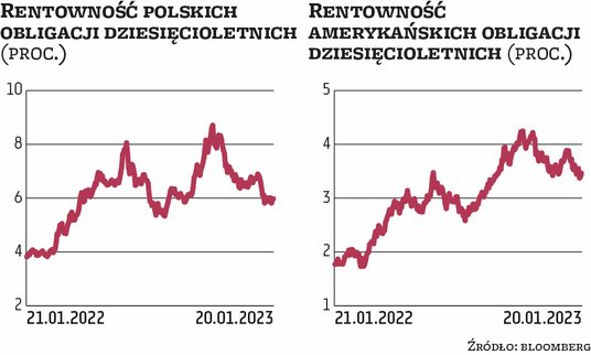 Na koniec tygodnia rentowność polskich papierów dziesięcioletnich sięgała 5,98 proc., dwuletnich zaś – 5,99 proc. W obu przypadkach obserwowaliśmy zwyżki po kilka punktów bazowych. Od około dwóch tygodni oprocentowanie polskich obligacji utrzymuje się pod pułapem 6 proc. Przypomnijmy, że na koniec 2021 r. dochodowość papierów dziesięcioletnich wynosiła 6,84 proc., zatem mówimy o spadku o ponad 1,8 pkt proc. w bardzo krótkim okresie. Warto zauważyć, że w ubiegłą środę dochodowość obligacji dziesięcioletnich spadła na moment do 5,75 proc. i jak dotąd był to najniższy poziom w tym roku. Kolejne dwa dni przyniosły więc lekkie odreagowanie, w ślad głównych rynków. „Podobnie jak na rynkach bazowych skarbowe papiery wartościowe notowały wzrost dochodowości. Nie były one jednak spowodowane danymi makro. Raczej jest to próba rynku do osiągnięcia przynajmniej krótkoterminowej stabilizacji po znacznej zmienności widzianej od początku roku” – komentowali analitycy Banku Gospodarstwa Krajowego. „Nie oczekujemy silnych sygnałów z rynków bazowych, a kolejne wystąpienia członków FOMC raczej już nie wniosą wielu nowych elementów przed lutową decyzją Fedu” – podano. Obecnie rynek się spodziewa, że na kolejnym posiedzeniu Fed podniesie stopy procentowe o 25 pkt baz., a do maja stopy w USA wzrosną do 5 proc. W przypadku Europejskiego Banku Centralnego główna stopa ma sięgnąć 3 proc.