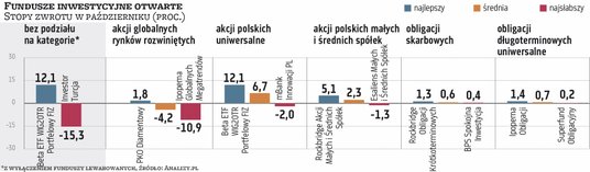 Wiele wskazuje, że fundusze akcji polskich szerokiego rynku dotrwają na pozycji lidera do końca roku. W październiku, przy mało sprzyjających wiatrach, średnio zarobiły 6,7 proc., odskakując o 3 pkt proc. drugim w kolejności funduszom akcji europejskich rynków wschodzących – wynika z danych Analizy.pl. Co do wyników poszczególnych produktów warto odnotować, że zwyżki dużych spółek wyniosły na szczyty portfele indeksowe. Numerem jeden w grupie funduszy akcji polskich uniwersalnych był ETF od Bety, naśladujący WIG20TR (WIG20 powiększony o dywidendę), natomiast na kolejnych pozycjach znalazły się Goldman Sachs Indeks Odpowiedzialnego Inwestowania, PKO Akcji Rynku Polskiego oraz inPZU Akcje Polskie O.