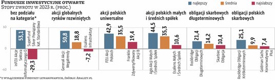 Za nami rewelacyjny rok dla niemal wszystkich klientów TFI. Szczególną satysfakcję czują zapewne zarządzający portfelami polskich akcji. W ostatnich latach bywało, że krajowy rynek był nawet najgorszy na świecie. Nie pomagały analizy wskazujące na ekstremalnie niskie wyceny krajowych spółek. Rok 2023 zmienił postrzeganie GPW na znacznie bardziej pozytywne. Do zwyżek potrzebni byli oczywiście inwestorzy zagraniczni, ale w ostatnich miesiącach widać też poprawę nastawienia do polskich akcji także wśród klientów TFI. Patrząc na zeszłoroczne stopy zwrotu, pewnie będą się zastanawiać, dlaczego zdecydowali się na polskie akcje tak późno. Zarówno fundusze akcji polskich szerokiego rynku, jak i małych i średnich spółek wypracowały w poprzednim roku przeciętnie po ponad 35 proc. Obie kategorie niemal ex aequo znalazły się na szczycie zestawienia wyników za 2023 r. – wynika z danych serwisu Analizy.pl. Fundusze polskich akcji pobiły konkurencję przynajmniej o kilka punktów procentowych. Trzecią grupą w 2023 r. były fundusze akcji europejskich rynków wschodzących. Kolejne miejsce znów należało do krajowych aktywów. Fundusze mieszane zrównoważone – dzięki współpracy akcji i obligacji – przyniosły w zeszłym roku średnio niemal po 26 proc. Dopiero czwarte były fundusze akcji amerykańskich, które finiszowały z 21,7 proc. zysku.