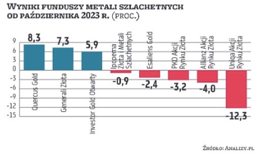 – Fundusze metali szlachetnych mogą mieć różne strategie inwestycyjne. Na przykład część funduszy inwestuje w instrumenty pochodne, których cena zależy bezpośrednio od kursu złota – tłumaczy Rafał Grzeszyk, zarządzający w Uniqa TFI. Jak dodaje, w tej grupie funduszy zachowanie ich jednostek powinno najbardziej odzwierciedlać notowania złota na giełdach światowych.